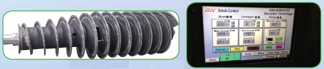 GNLW系列泥浆离心机( Decanter Centrifuge) 又称卧式螺旋卸料沉降离心机、泥浆离心机,是针对石油钻井液的特点,设计的固液分离专用设备,可在全速运转下完成进料、离心沉降、卸料等各道工序,主要用于回收重晶石,清除细小固体,降低钻井液的固体含量,控制钻井液的密度、粘度,保证钻井液的性能以及对快速钻井均有重要作用。GNLW系列离心机是利用离心沉降原理对钻井悬浮液进行分离,悬浮液由进料管经螺旋推料器中出液孔进入转鼓,在离心力 的作用下固相颗粒被推向转鼓内壁,通过螺旋推料器上的叶片推至转鼓小端排渣口排出,液相则通过转鼓大端的溢流孔溢出。如此不断循环,以达到连续分离的目的。沉降型离心机属于卧式螺旋离心机范畴,全称卧式螺旋沉降型离心机。冠能固控生产的卧式沉降型泥浆离心机广泛应用于石油钻井行业。