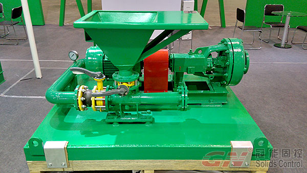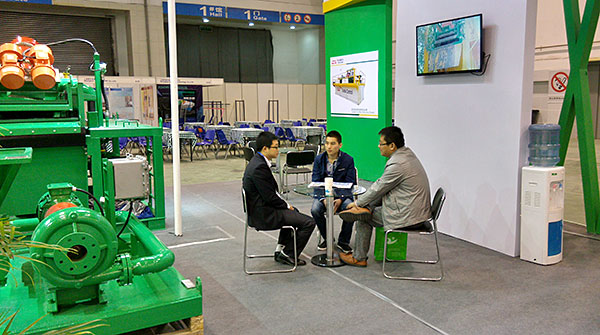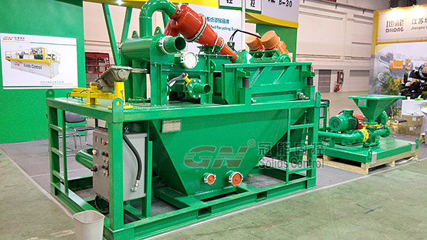本次展会主要展出了120m³/h处理量的泥浆回收系统及配套的射流混浆系统,主要配置了一台GNZY753E-Y1S型筛泥一体机,双层筛网设计,面积达到2.225m³,可分离固相粒度40微米,旋流器采用高质量聚氨酯材质,耐磨,使用寿命长,振动电机采用国际意大利OLI品牌或者美国马丁品牌,筛箱底框采用不锈钢材质,振动强度达到7.1G(可调),并配有GNSB6×5A(37KW)离心泵为除泥供浆泵,采用机械密封,使用寿命长并便于维修。整套系统撬装设计,移动便捷,使用方便。